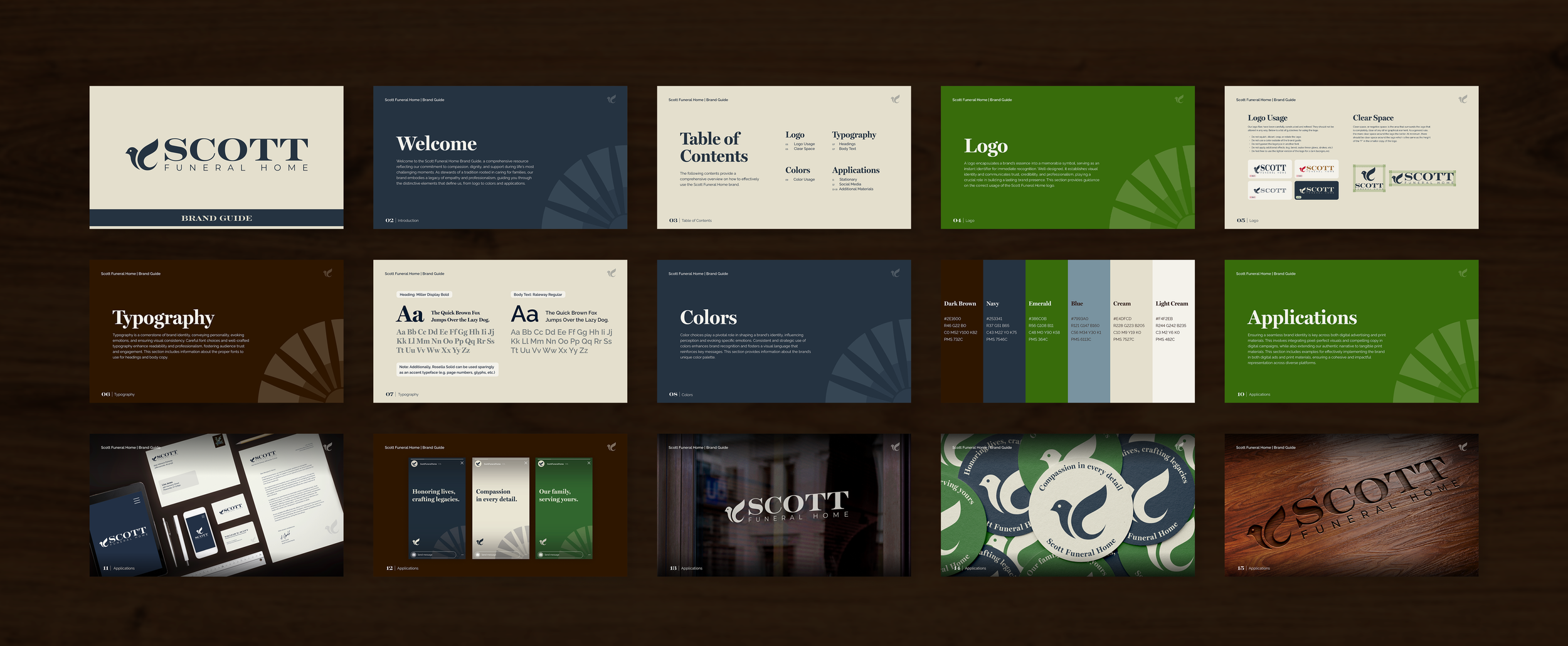 Since 1930, the Scott Family of Jeffersonville, Indiana, has operated their family-owned funeral home. They are very proud of their enduring community service. To enhance the Scott Funeral Home business, RedTag updated its brand with a new logo, typography, and colors. These elements were meticulously designed to radiate a warm and inviting tone, mirroring the family's dedication to tradition and community service. The refreshed brand seeks to elevate the funeral home's image, offering a comforting and supportive presence for those they serve, while also reinforcing their commitment to compassionate care and longstanding service to the community.